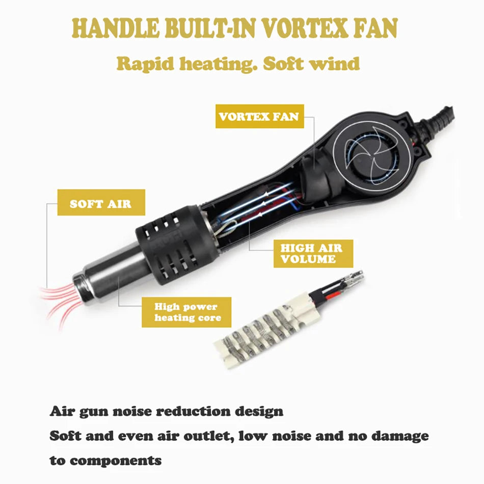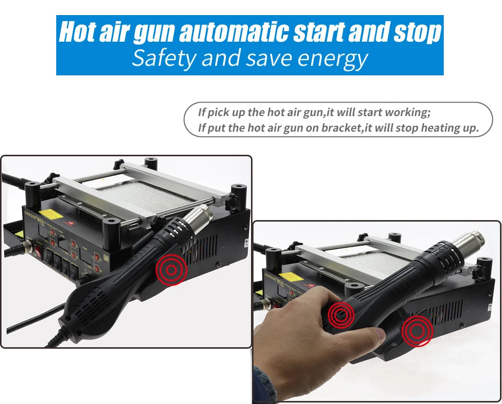 * The hot air station handle has an induction button, has automatism cold wind function,it will go to the saving energy state automatically when the temperature is below 100℃, prolong the heater life and protect the hot air gun.