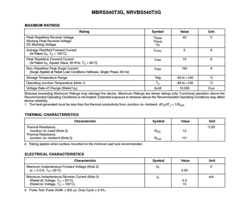 Diodo Rectificador Schottky Potencia MBRS540T3G (B540) SMD SMC 5A 40V - Lote 10 Piezas