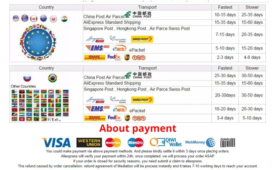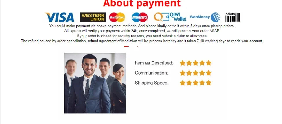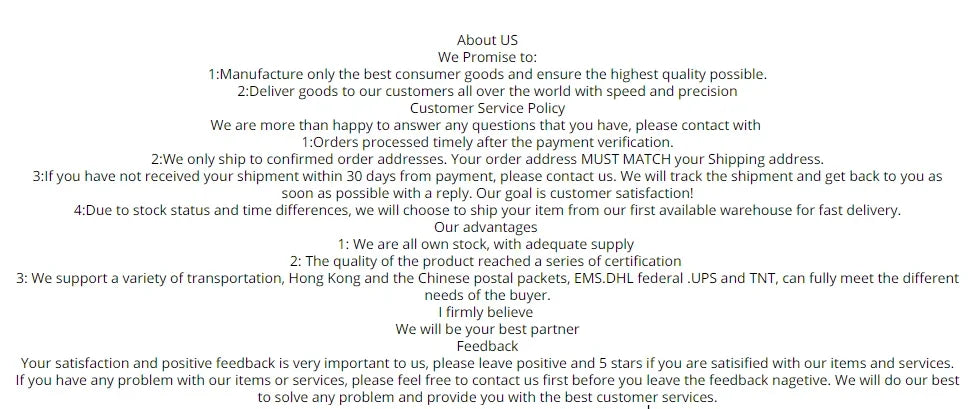 About US We Promise to: 1:Manufacture only the best consumer goods and ensure the highest quality possible. 2:Deliver goods to our customers all over the world with speed and precision Customer Service Policy Customer Service Policy We are more than happy to answer any questions that you have, please contact with 1:Orders processed timely after the payment verification. 2:We only ship to confirmed order addresses. Your order address MUST MATCH your Shipping address. 3:If you have not received your shipment within 30 days from payment, please contact us. We will track the shipment and get back to you as soon as possible with a reply. Our goal is customer satisfaction! 4:Due to stock status and time differences, we will choose to ship your item from our first available warehouse for fast delivery. Our advantages 1: We are all own stock, with adequate supply 2: The quality of the product reached a series of certification 3: We support a variety of transportation, Hong Kong and the Chinese postal packets, EMS.DHL federal .UPS and TNT, can fully meet the different needs of the buyer. I firmly believe We will be your best partner Feedback Your satisfaction and positive feedback is very important to us, please leave positive and 5 stars if you are satisified with our items and services. If you have any problem with our items or services, please feel free to contact us first before you leave the feedback nagetive. We will do our best to solve any problem and provide you with the best customer services