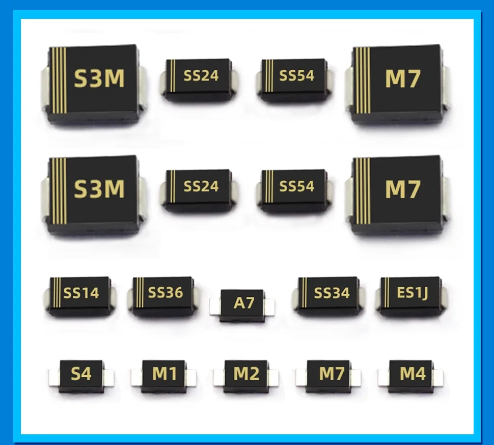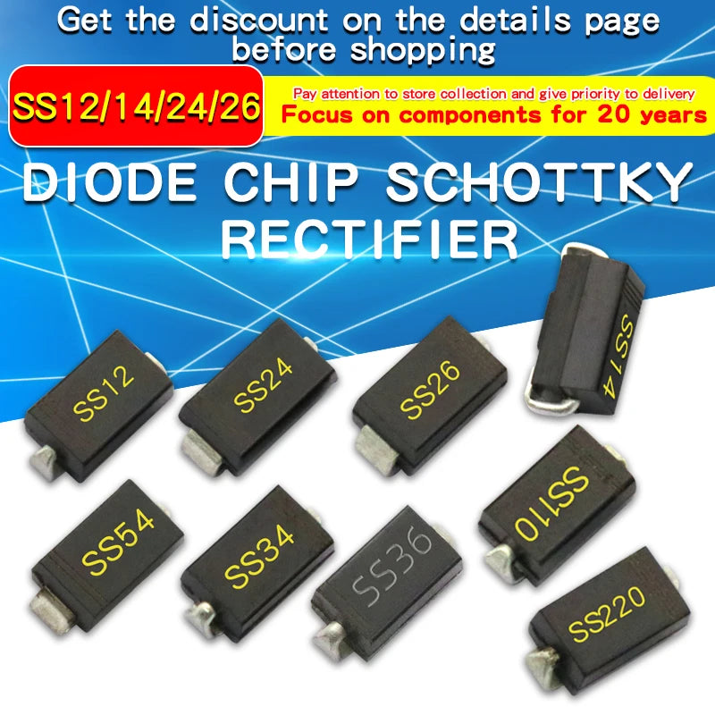 Diodo Schottky SMD (SS12/SS14/SS24/SS26/SS34/SS36/SS54/SS110/SS2200, SMA) (20 Unidades)