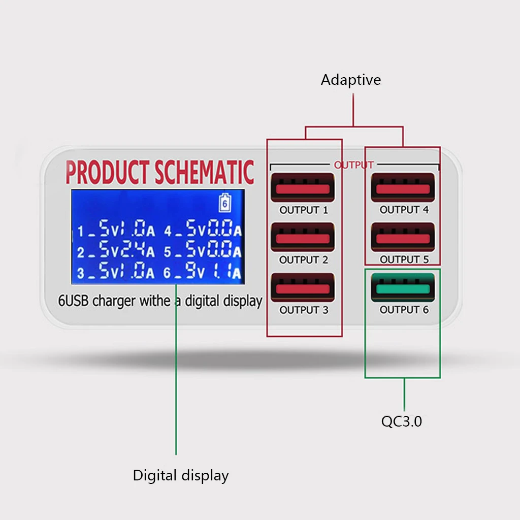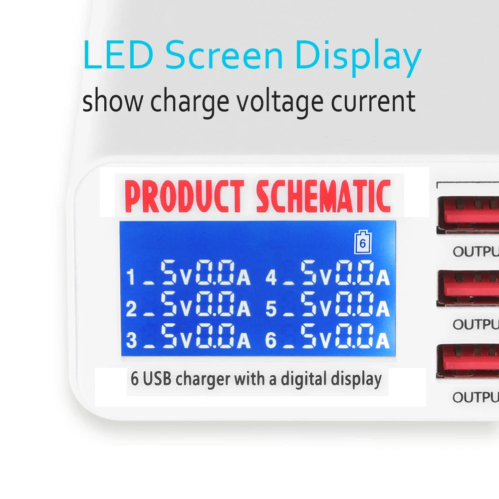 6 USB Charger HUB Charge 6 Device At Same Time LED Screen Display Show Charge Voltage Current USB Fast Charger