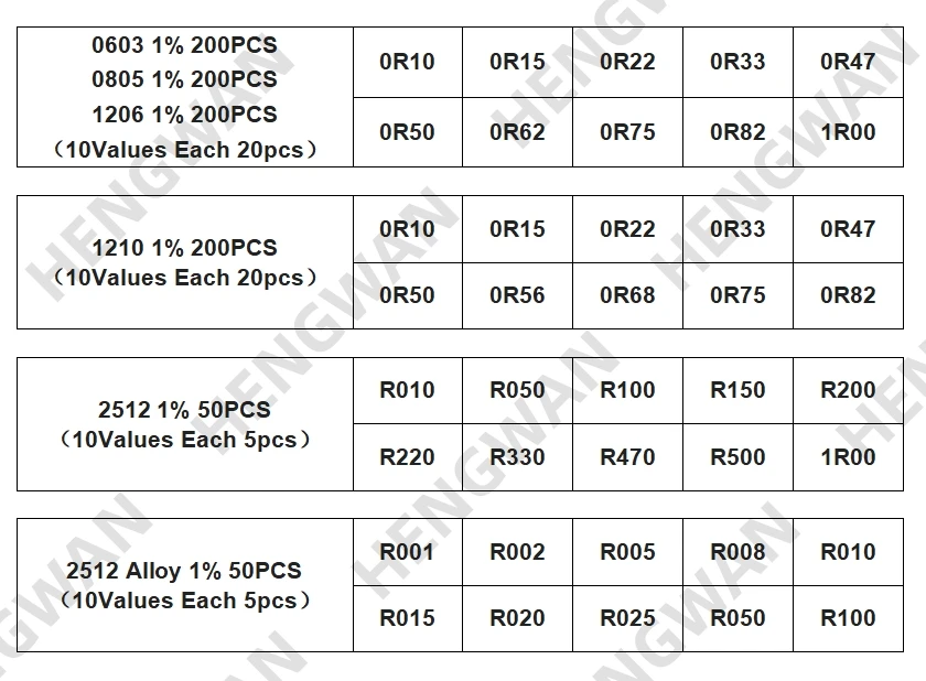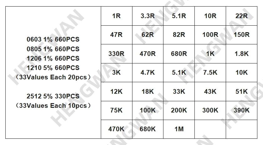 Kit Surtido Resistencias SMD 1% (0201-1206, 33 Valores x 20pcs = 660pcs, 1R-1M Ohm) Set Resistencia