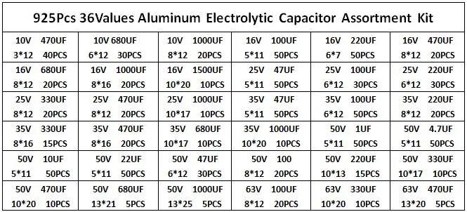 Kit Surtido Capacitor Electrolítico Aluminio Bajo ESR (1uF-470uF, 36 Valores) - Pack 925 Piezas