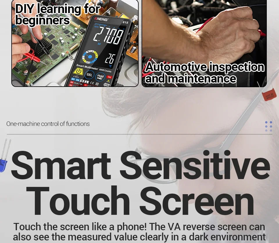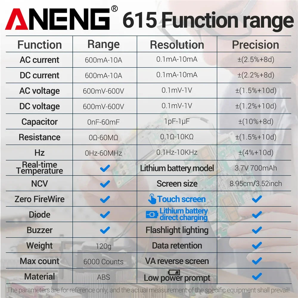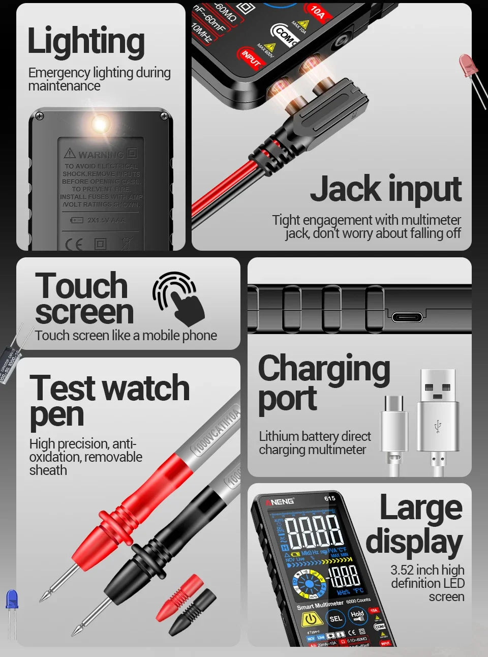 Multímetro Digital Inteligente ANENG AN-615 - Táctil Recargable (6000 Cuentas) Tester Voltaje/Corriente AC/DC