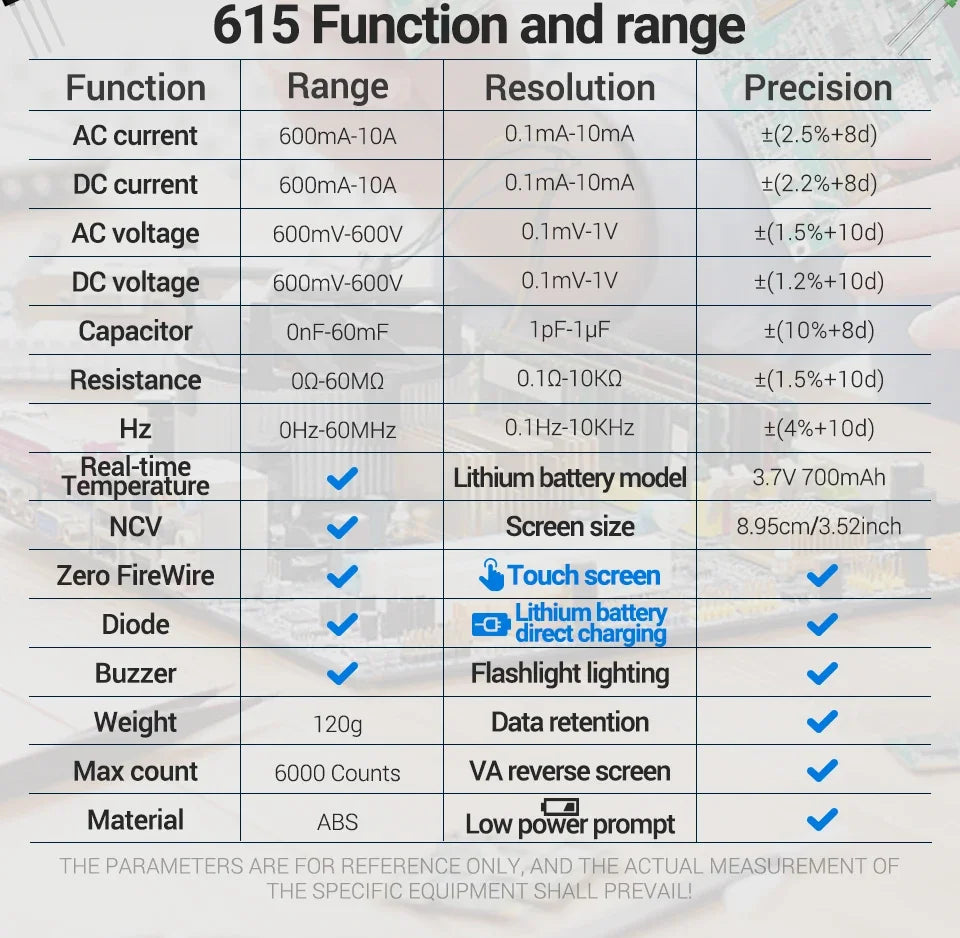 This instrument performs AC/DC voltage, AC/DC Current,Resistance, Audible Continuity, Diode, Frequency and Temperature measurements; it is a 3 5/6 digits, 6000 counts auto ranging DMM.