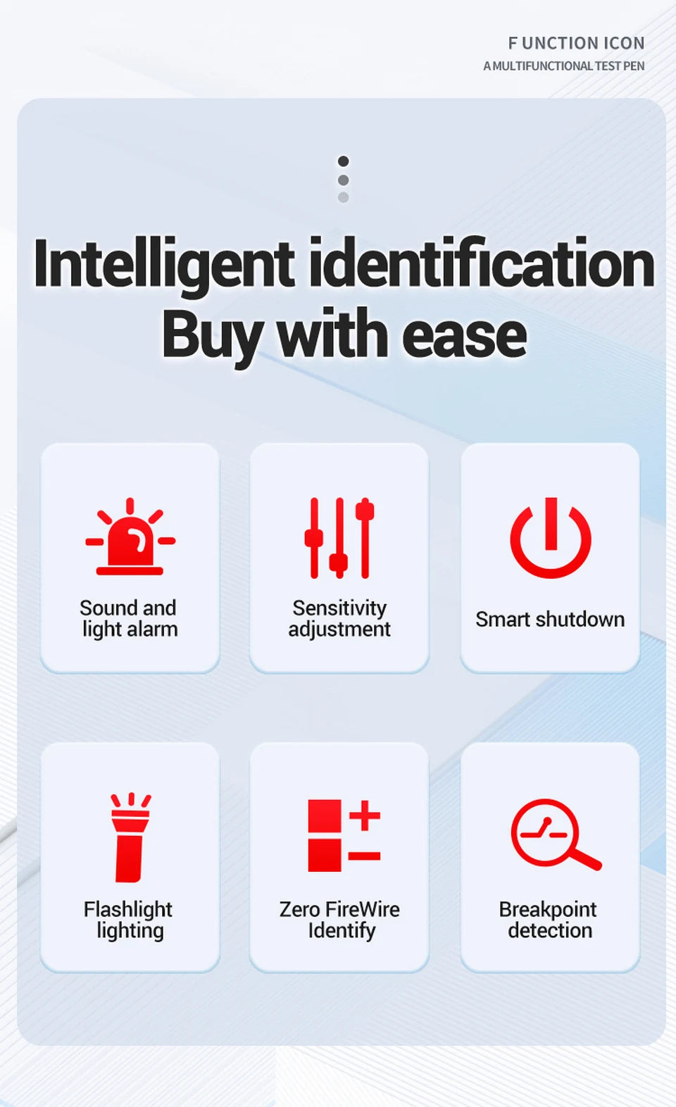 The starting default AC voltage detection range of the tester: About 48〜lOOOV.Press the AC voltage detection range switching button (S), the detection range indicator lights up, and the detectable voltage range of the tester is about 12〜1000V. Press the AC voltage detection range switching button (S) again, the detection range indicator lights off, and the detectable voltage range of the tester is about 48〜lOOOv. 6.Automatic shutdown function When there\'s no operation of the tester and there's no voltage signal detected by the tester within 5 minutes, the tester will power off automatically. 7 .Battery undervoltage indication When the battery voltage is lower than about 2.6V, the power indi cator flashes for 3 times,while the buzzer makes a sound and then turns off. Please replace the battery timely. Before use, specially check whether the probe is cracking or broken. If you suspect there\'s a problem, please send the tester forrepair timely. Please do not apply voltage exceeding rated voltage indicated on thetester. When testing voltage above AC 36V, be very careful, to avoid eletiicsliock. Please comply with local and national safety codes. Use proper protective equipment according to regulations of local or national authorities.