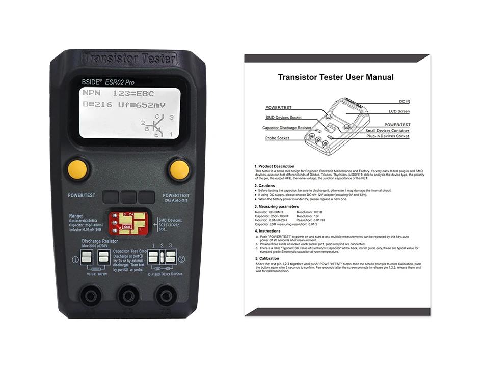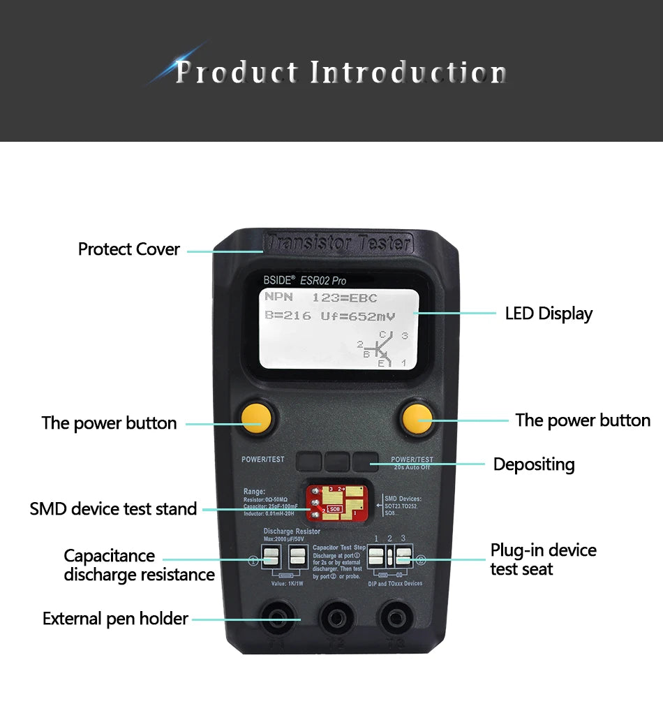 This meter is a small tool for the engineer, electronic maintenance and factory. It is very easy to test plug-in and SMD devices, it can also test different kinds of diodes, triodes, thyristors, MOSFET, enable to analysis the device type, the polarity of the pin, the output HFE, the valve voltage, the junction capacitance of the FET.
