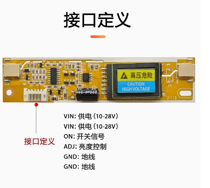 VIN: power supply (10-28V) VIN: power supply (10-28V) ON: switch signal ADJ: Brightness control GND: Ground GND: Ground