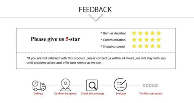 If you are satisfied with our items , please just give us five star positive feedback (no need show photos in the feedback)