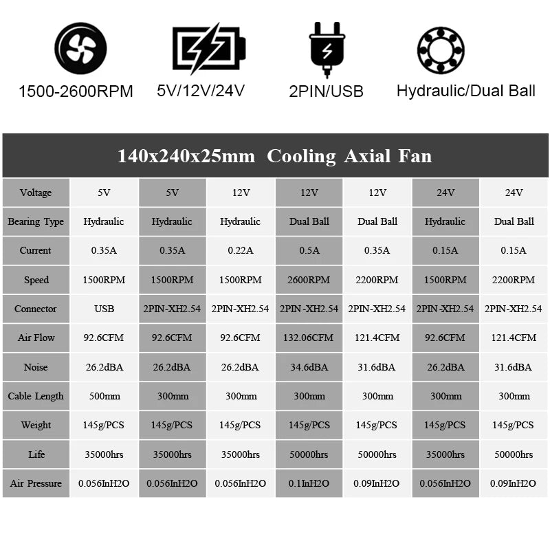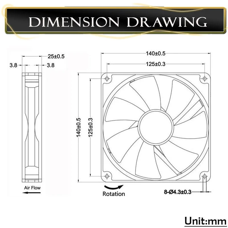 140mm x 140mmx 25mm PC Fan with High-airflow and High Quality & Long Using Life and made by high quality eco-friendly materials that are certificated by CE & ROSH.