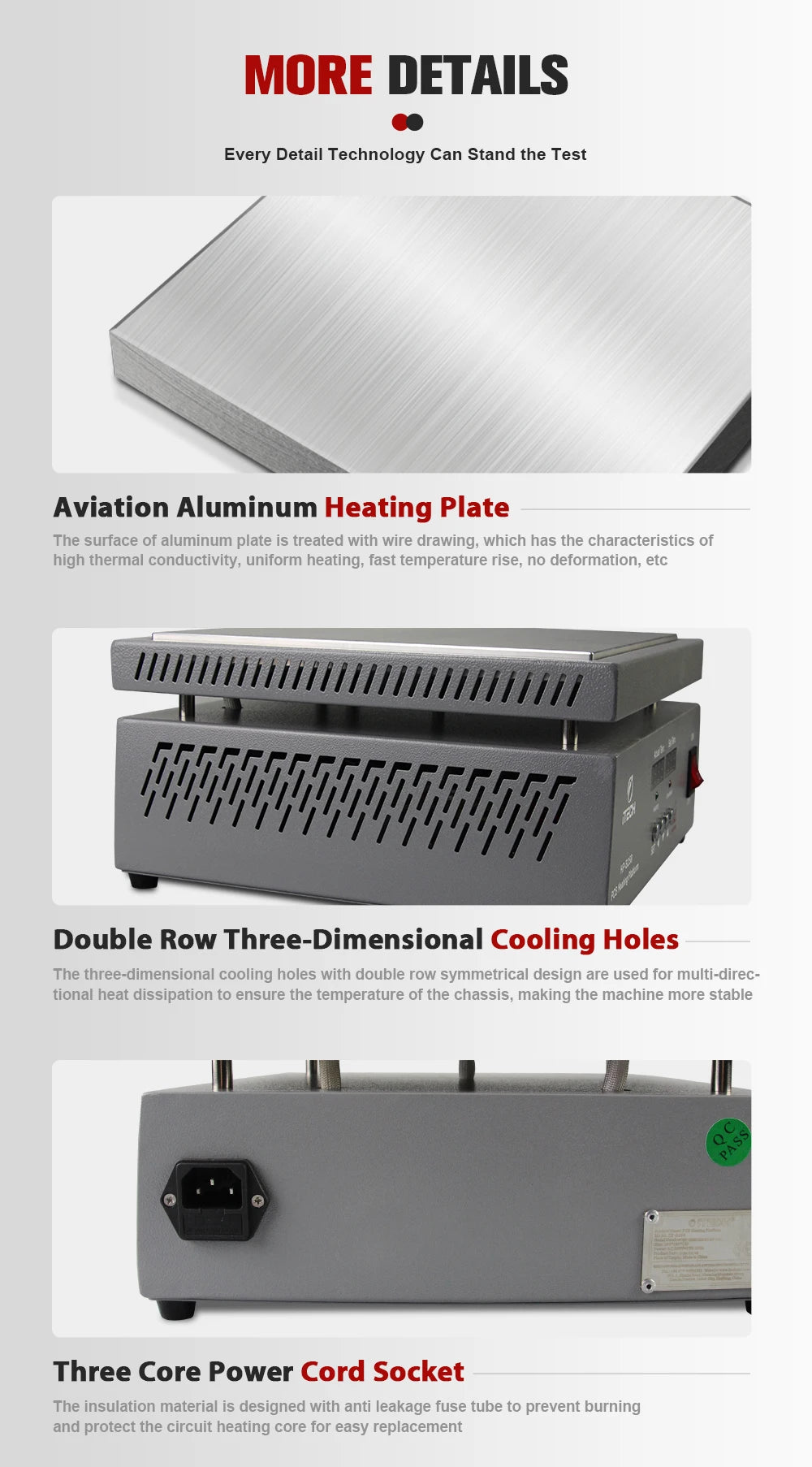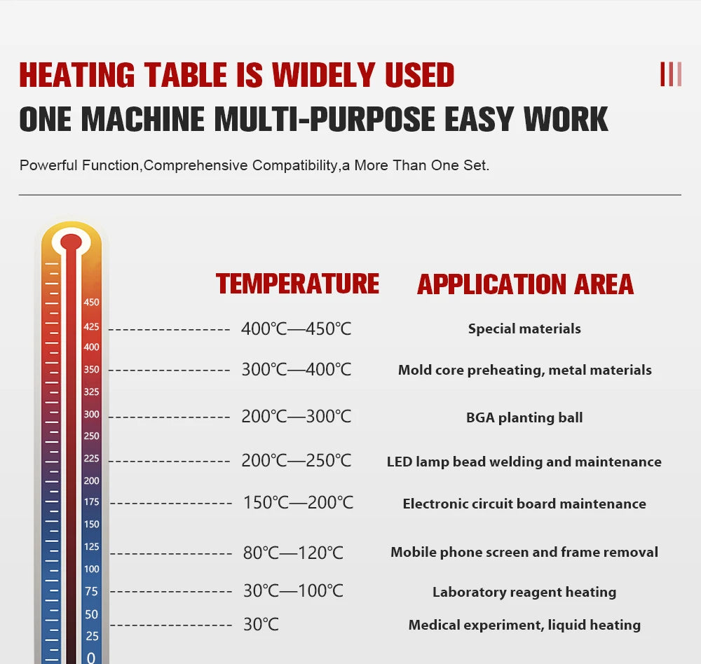 mobile phone repair, aluminum plate LED lamp bead soldering, preheating, sealing glue dispensing for PCB, die die mandrel preheating, chemical test, heat curing, solid state relay chip welding etc, simple operation, high working efficiency, and, is your production and processing good helper.This machine adopts high efficiency heating tube multi-tube technology combined with high quality aluminum plate as the heating body heating tube is easy to replace, heat transfer uniform, high conduction efficiency.Temperature is controlled by PID intelligent, temperature control is accurate, intuitive, beautiful shape. Our quality policy: "Continuous improvement, continuous and effective, the customer first" Huaqi Zhengbang wholeheartedly for your service!