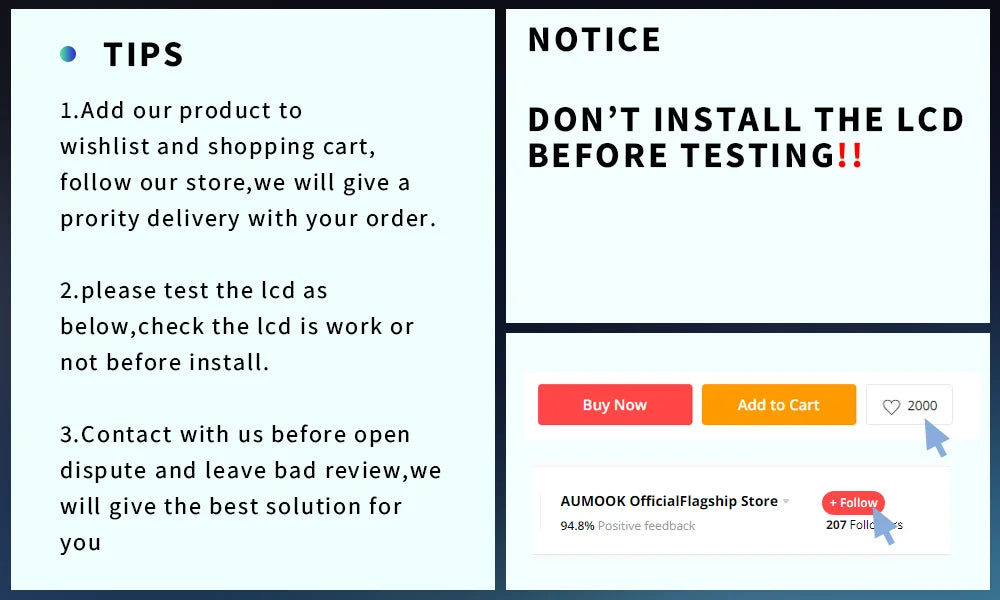 ①.The LCD screen must be tested before installation;Please link the LCD to the motherboard for testing;