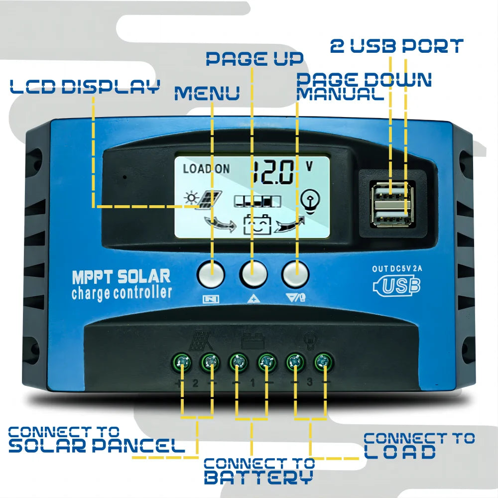 Controlador Carga Solar MPPT 30A-100A 12V/24V Dual USB LCD Regulador con Carga Panel Batería