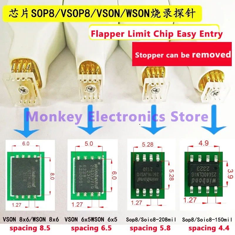 Sop8-150mil/VSop8-208miIVSON6x5/WSON 6x5 package VSON 8x6/WSON8x6 package/QFN8/DFN8 chip chip chip probe line, TV motherboards, industrial motherboards, automotive electronics home appliance motherboards, computer motherboards, air conditioning E-square burn-in, burn-in thimbles read/write spring pins, 8-pin 1.27mm.