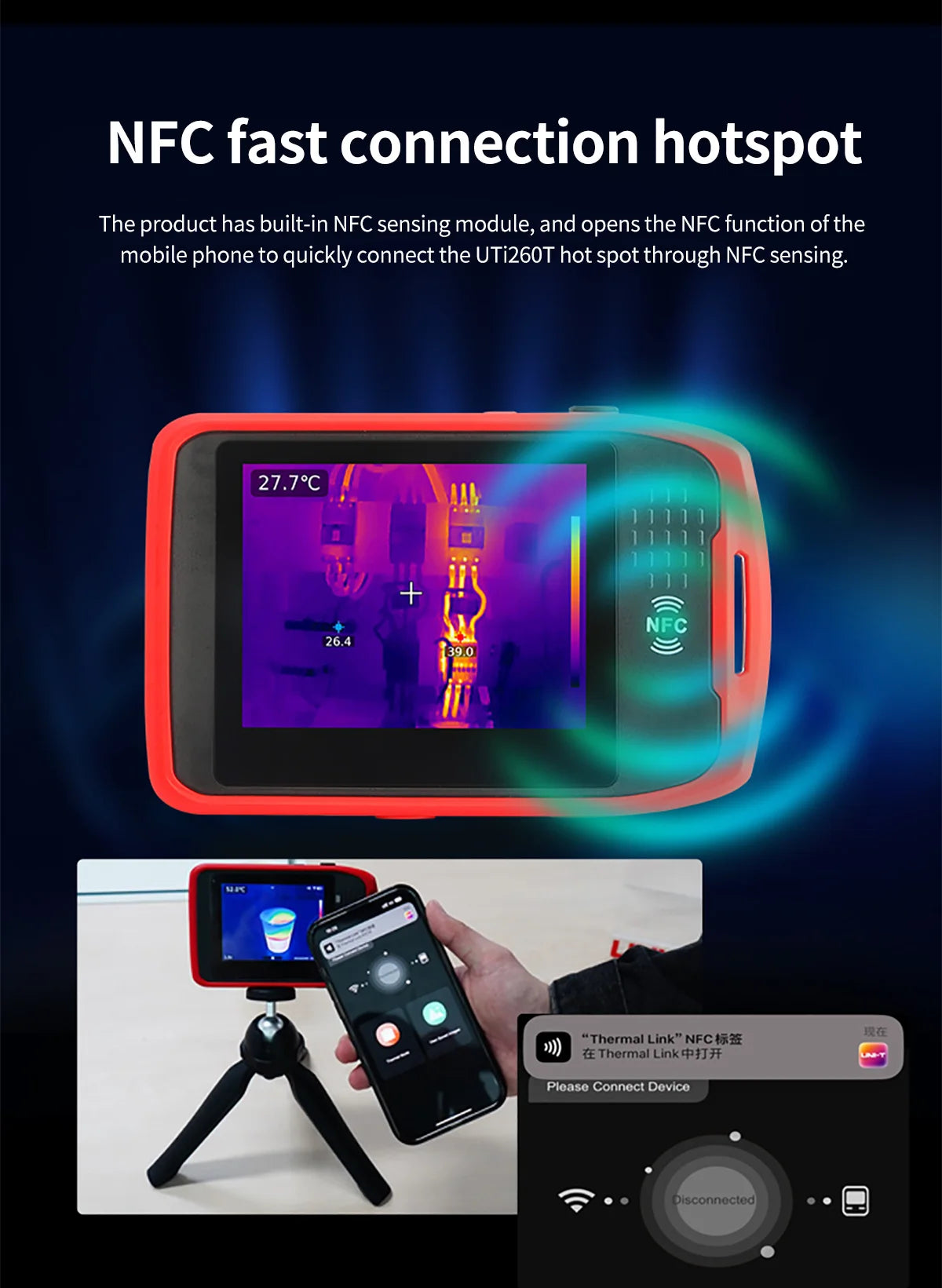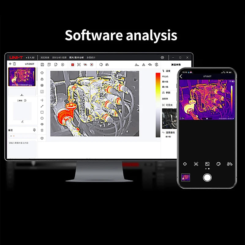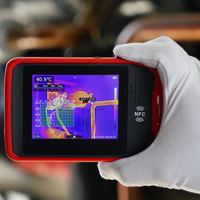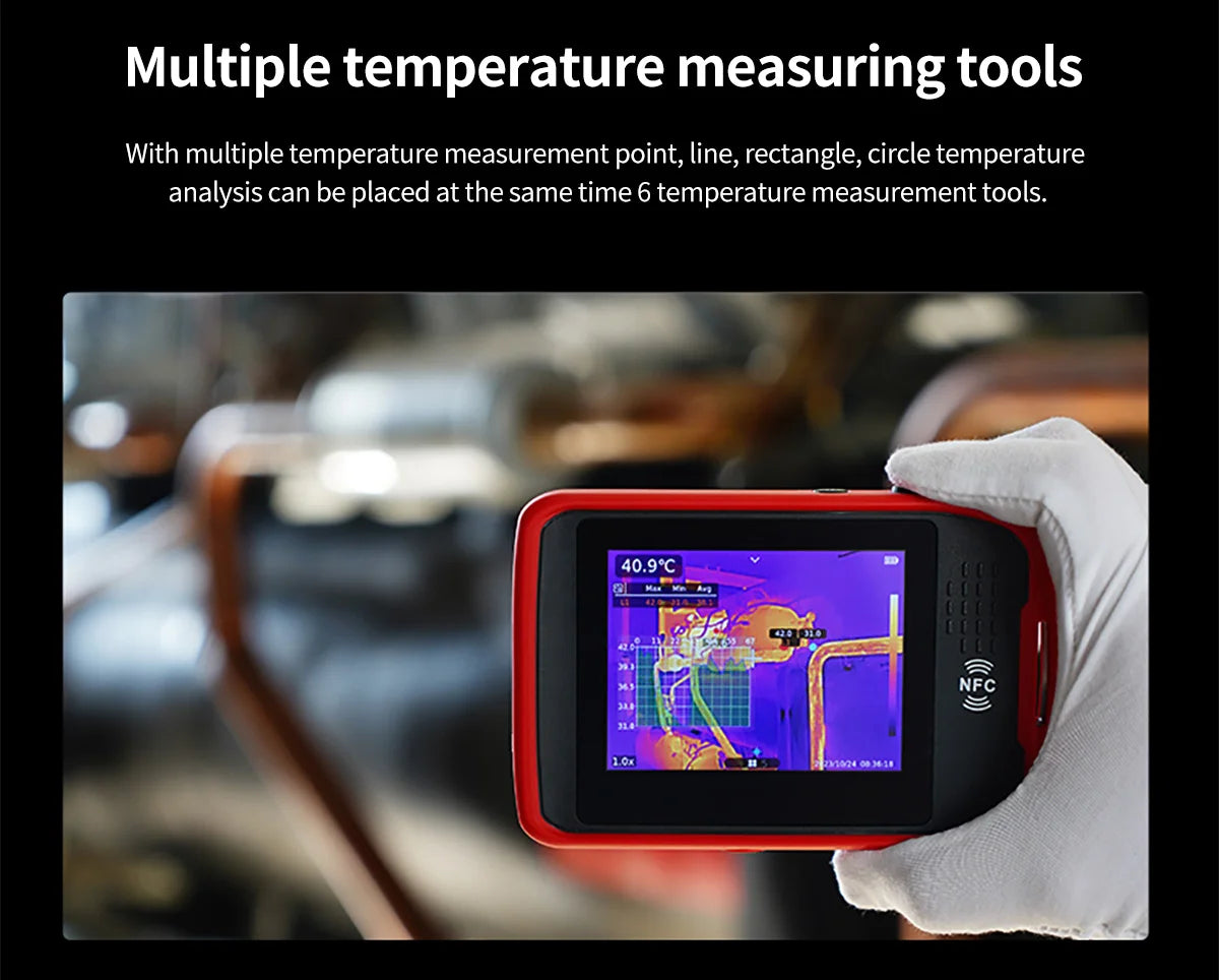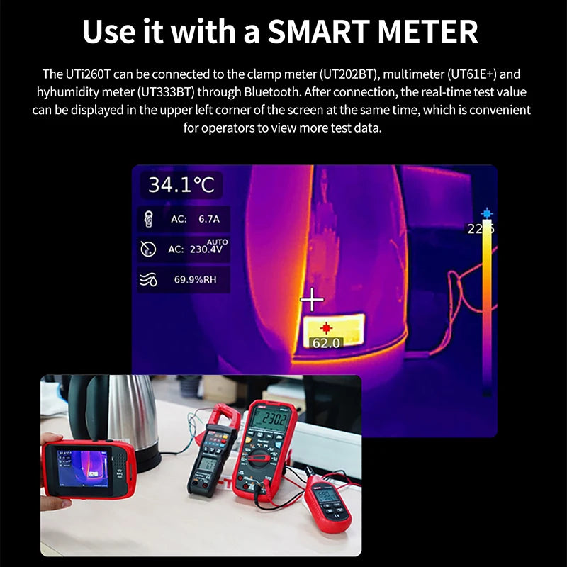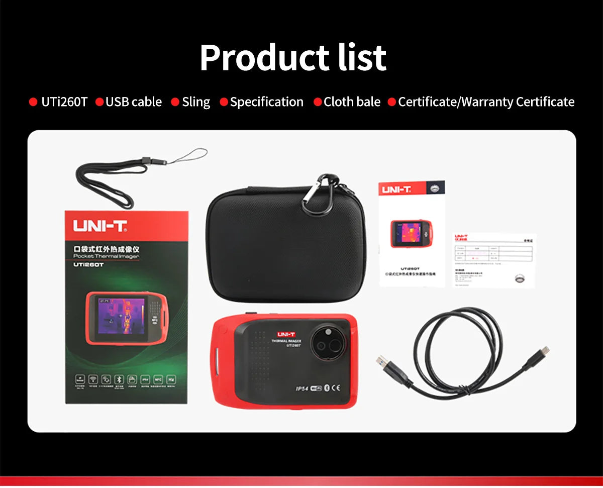 UTi260T is a thermal imager in card style with portable designand multiple functions, equipped with HD capacitive touch screen,convenient operation and high imaging quality. lts unique NFCfunction, automatically connects Wi-Fi quickly, with professional App and mobile video transmission. lts function of Bluetooth canbe connected with meters, such as the Temperature HumidityMeter, and the real-time test data showed.