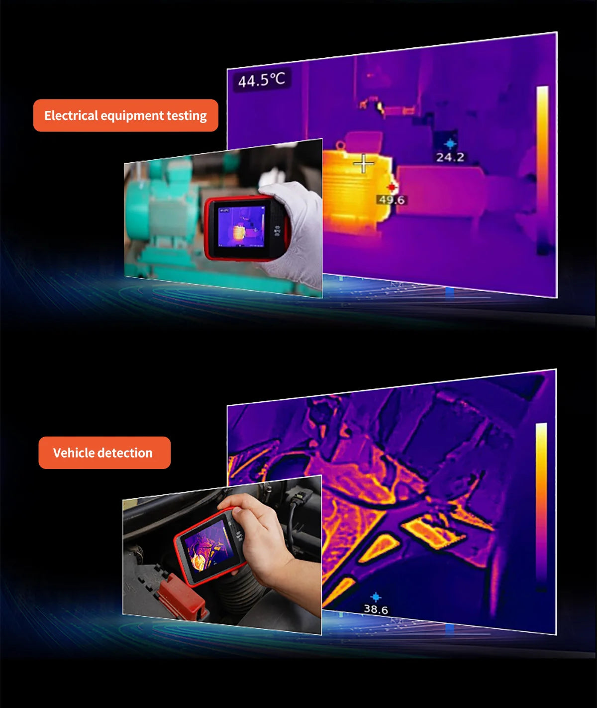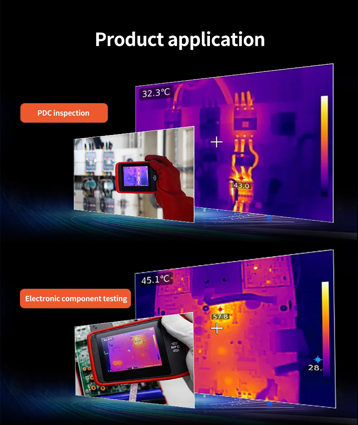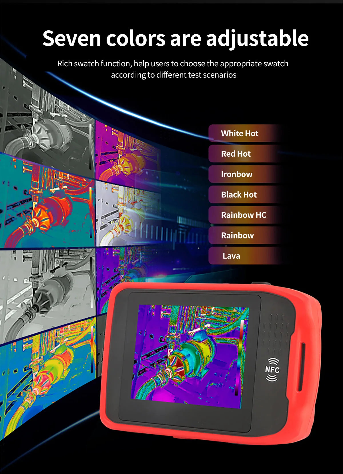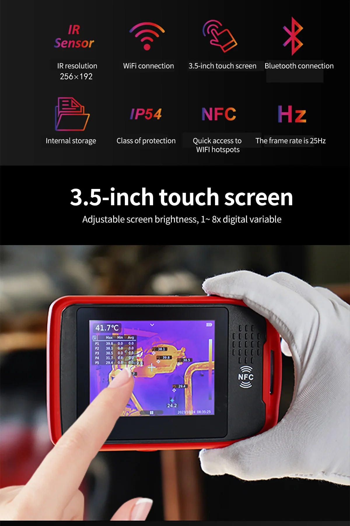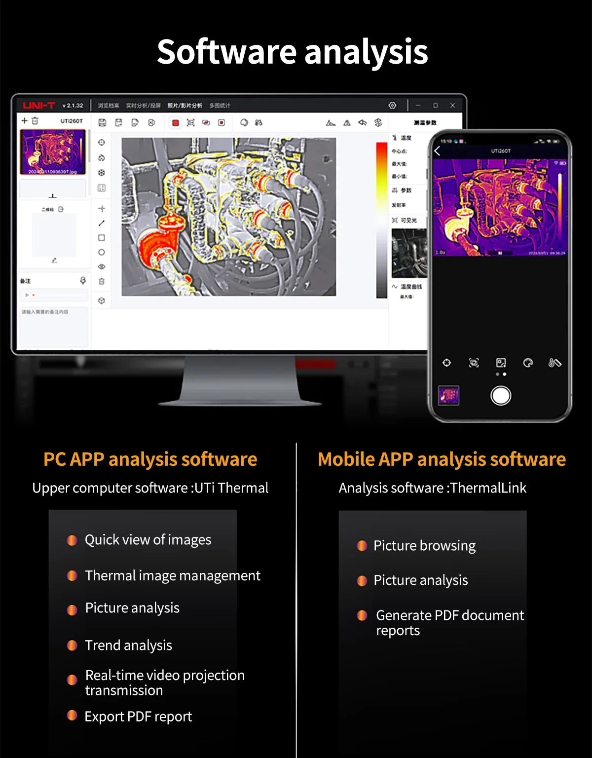 UTi260T is a thermal imager in card style with portable designand multiple functions, equipped with HD capacitive touch screen,convenient operation and high imaging quality. lts unique NFCfunction, automatically connects Wi-Fi quickly, with professional App and mobile video transmission. lts function of Bluetooth canbe connected with meters, such as the Temperature HumidityMeter, and the real-time test data showed.