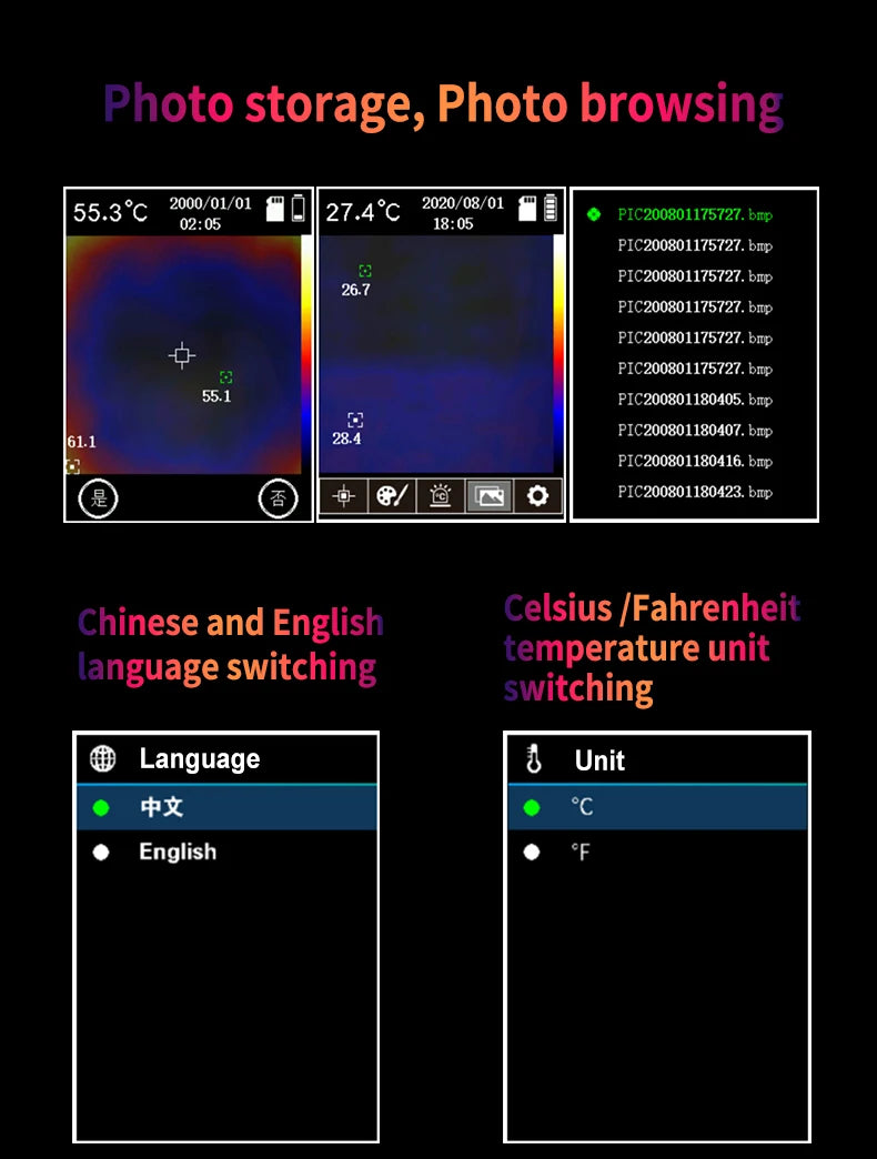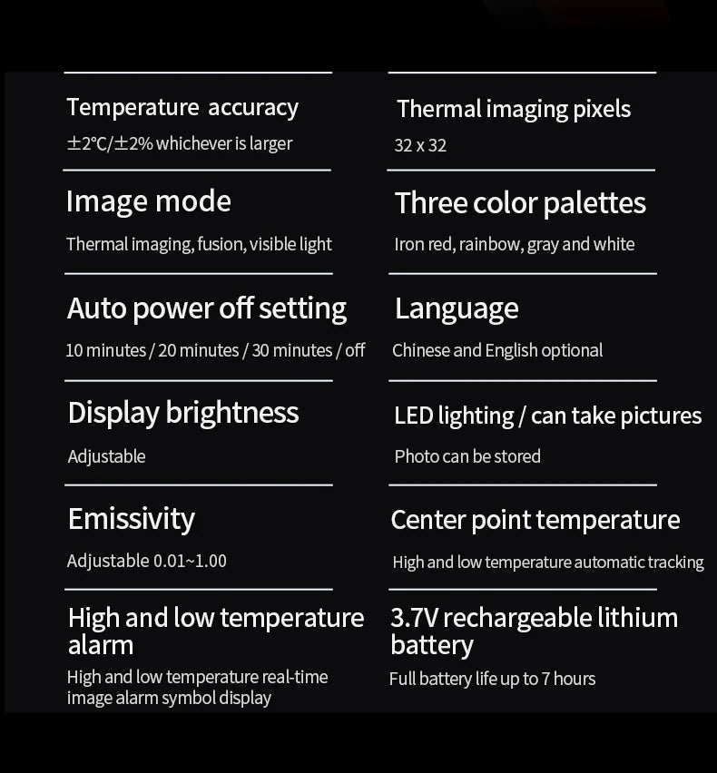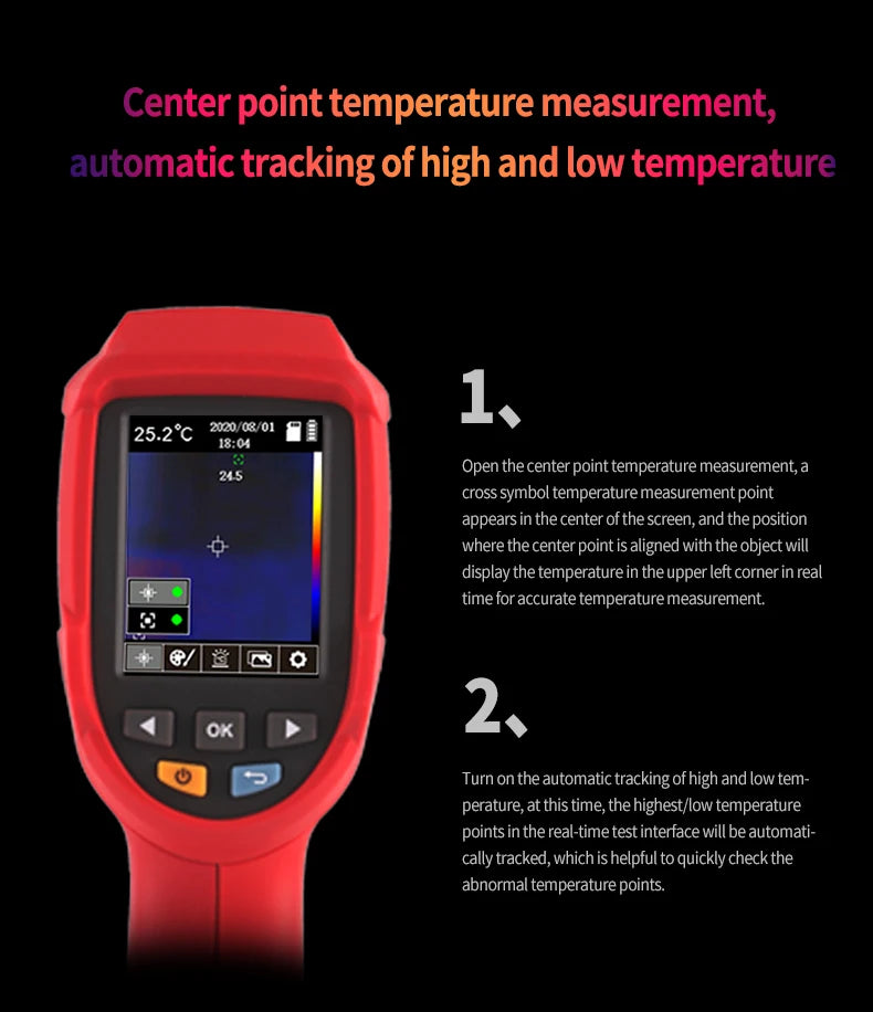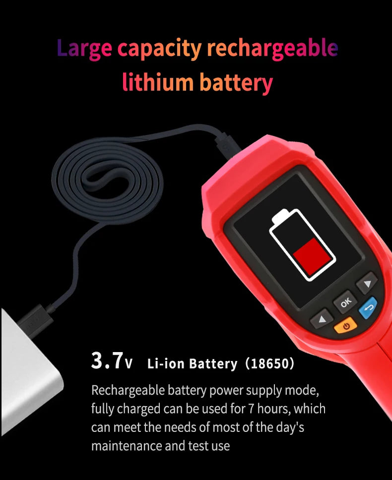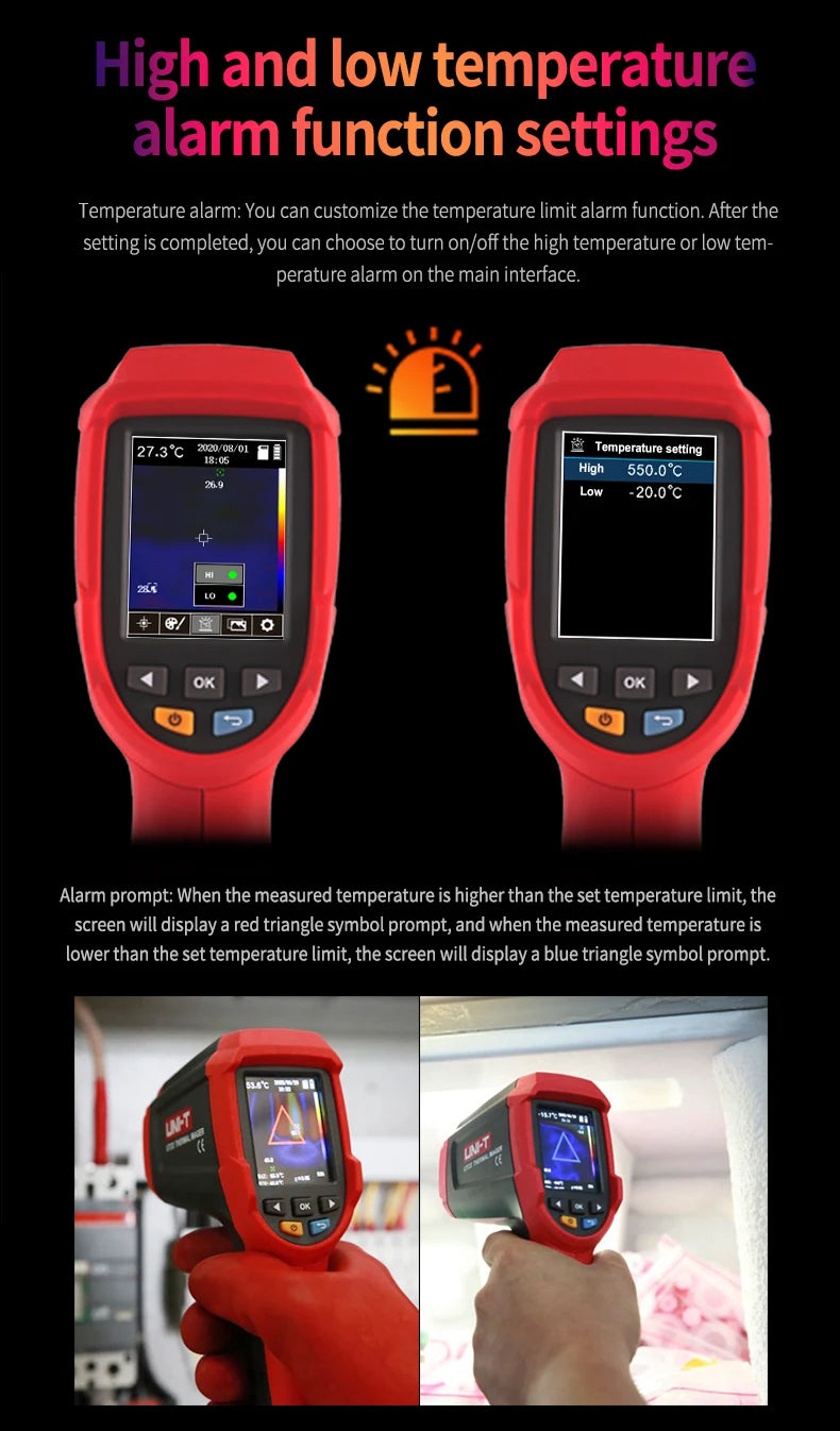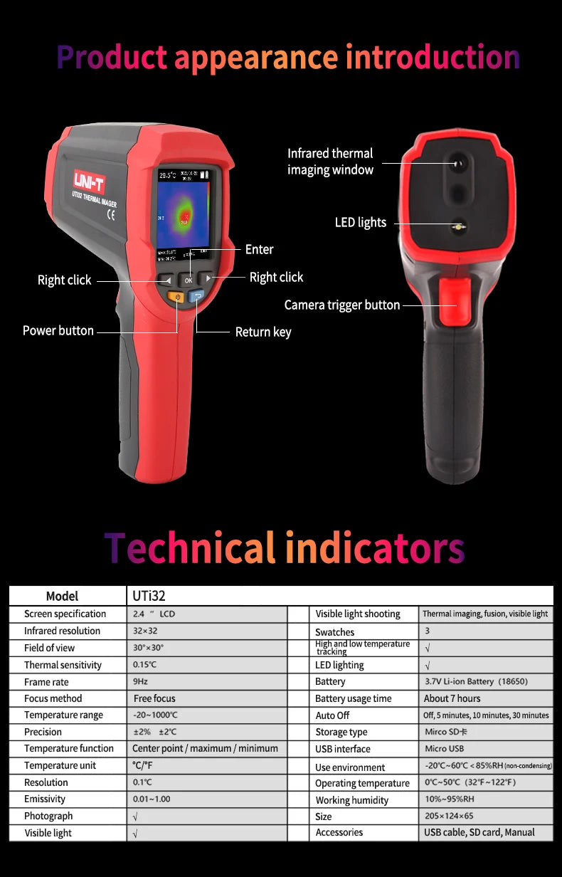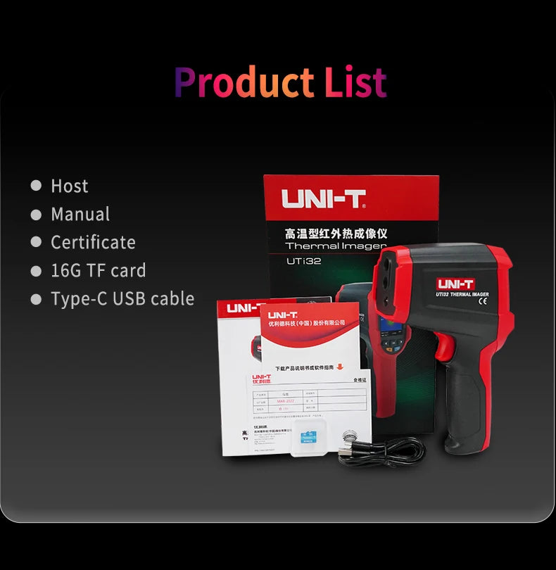 UTi32 is a high temperature thermal camera that specially designed for higher temperature applications,such as: iron forging, glassware & porcelain production, petrochemical,metallurgy,etc. It can quickly detect the temperature from -20℃ to 1000℃ and auto tracking and alarm for hot/cold spot. UTi32 is a portable and lightweight thermal imager with 30000pixels digital camera, with three image modes: thermal, visual image,fusion, and more than 7 hours battery operation time. It is an affordable and reliable tool for high temperature inspection.