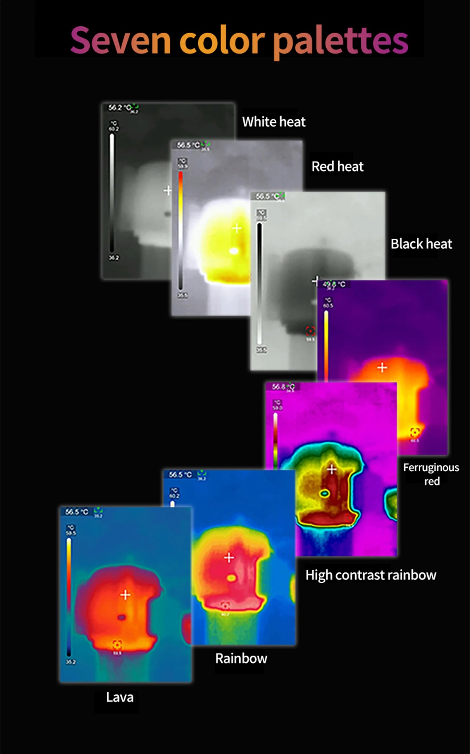 9.Color palettes: 7 (White hot, Black hot, Red hot Ironbow, Lava, Rainbow, Rainbow HC)