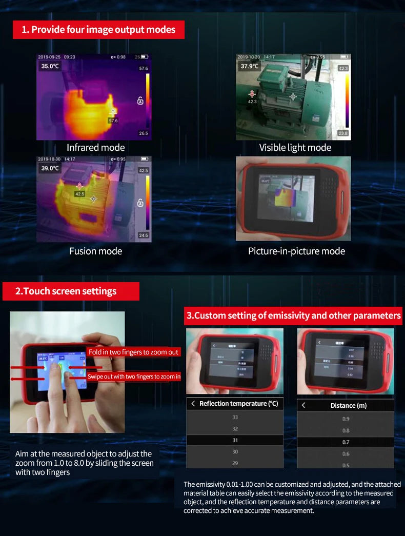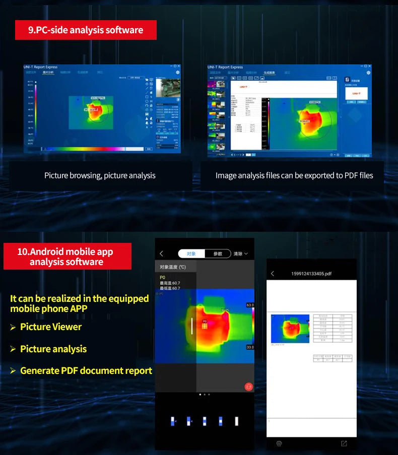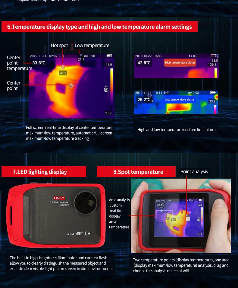 UTi120T is a portable and powerful pocket temperature measuring thermal imager. It is a portable instrument used by electrical professionals, construction professionals, engineers and DIY owners.It is a thermal imager product with cost-effective perormance such as capacitive touch screen, image fusion, high and low temperature tracking and WIFI.