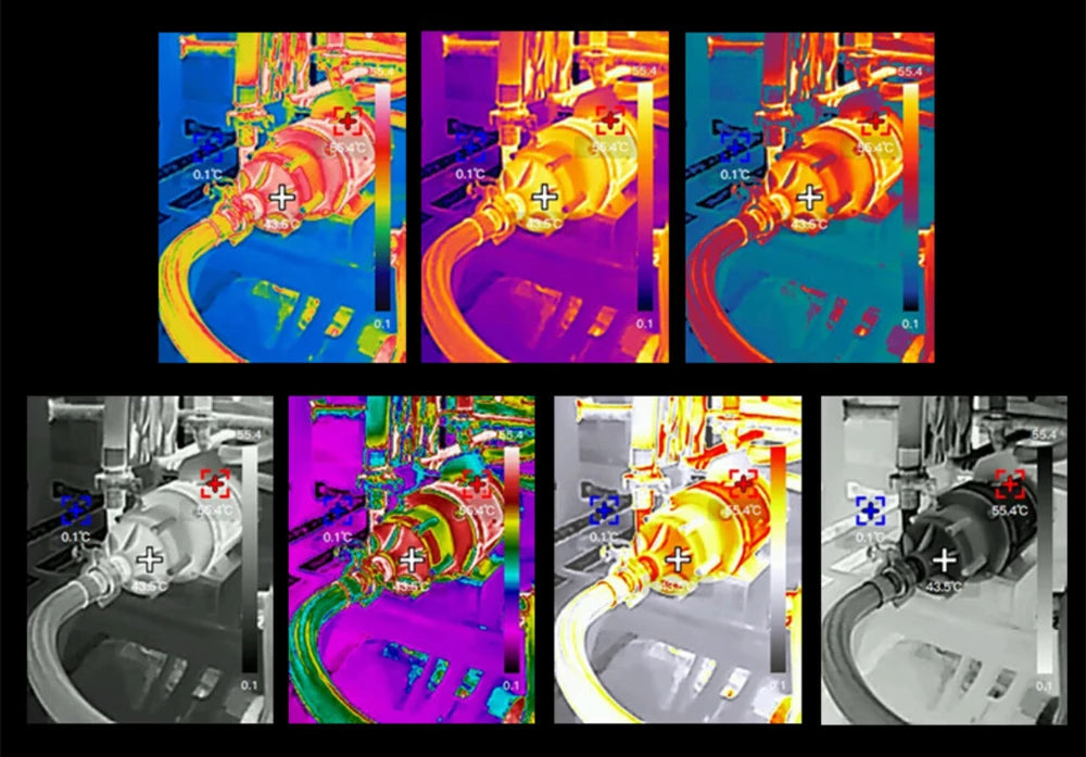 Color palette: Iron Red, Rainbow, White Heat, Black Heat, Red Heat, Lava, High Contrast Rainbow