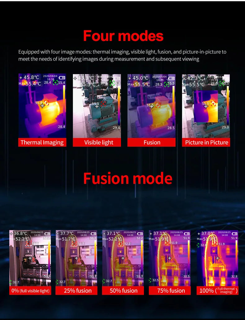 It is cost effective and with a wide temperature range: -20℃~550℃. It has higher IR resolution: 256×192 pixels than other models, and includes 7 color palettes and four display modes: thermal, visual image, fusion, and picture in picture. It is also user friendly and rugged enough to pass IP65 and 2m drop test.