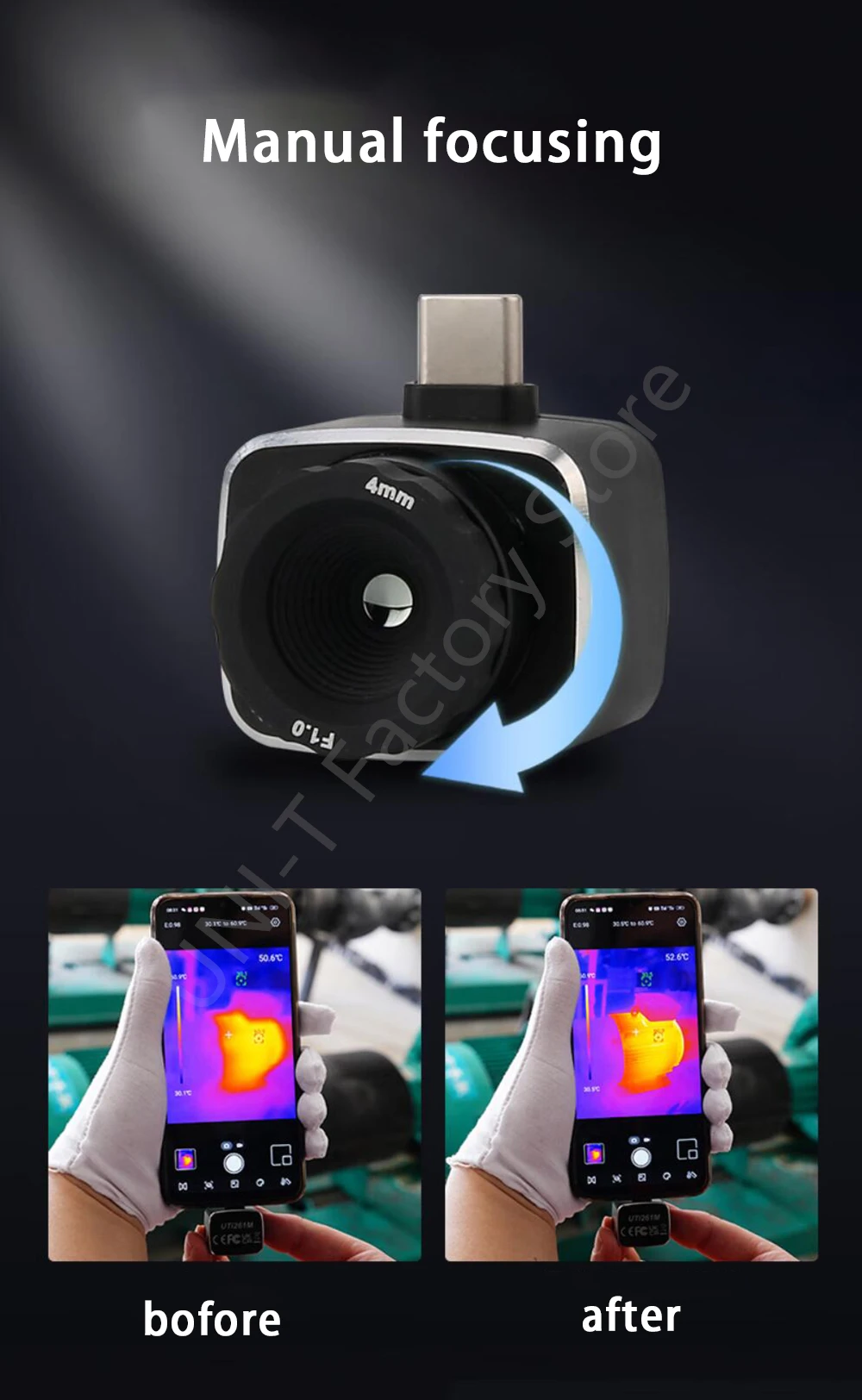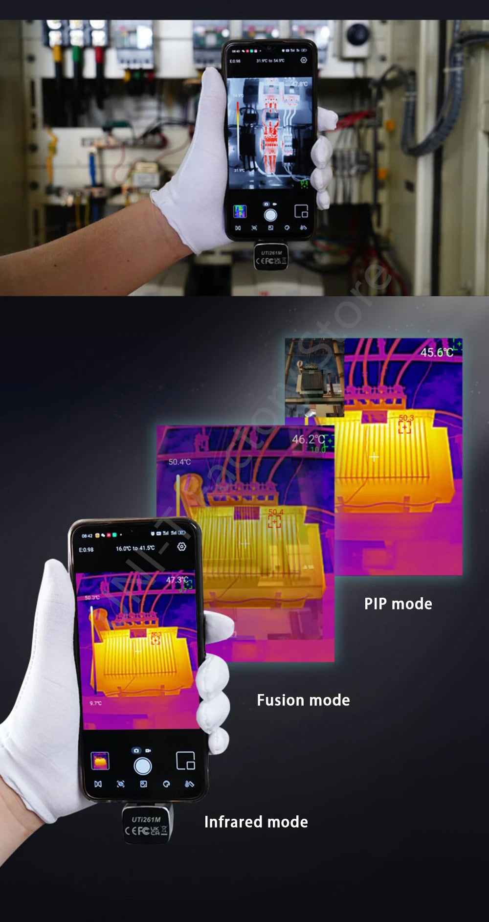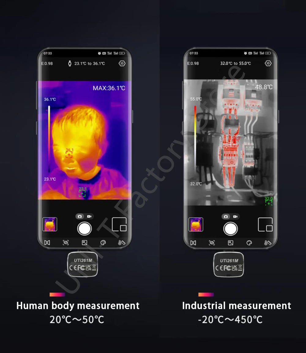 The UTi261M infrared thermal imager can be used in conjunction with mobile phones for infrared thermal imaging temperature measurement. It is compact, portable, and easy to operate. two hundred and fifty-six × 192 pixels, delicate image quality for physical examination. The manual focusing function allows for clearer details on top of excellent imaging. 25Hz frame rate, smooth video without lag, allowing you to quickly and conveniently discover hidden problems- A wide range of 20-450 ℃, covering a wide range of applications, and can also achieve real-time temperature measurement, night vision, photography, video recording and other functions through mobile apps. It is a versatile assistant for your daily work, home life, and adventure travel.