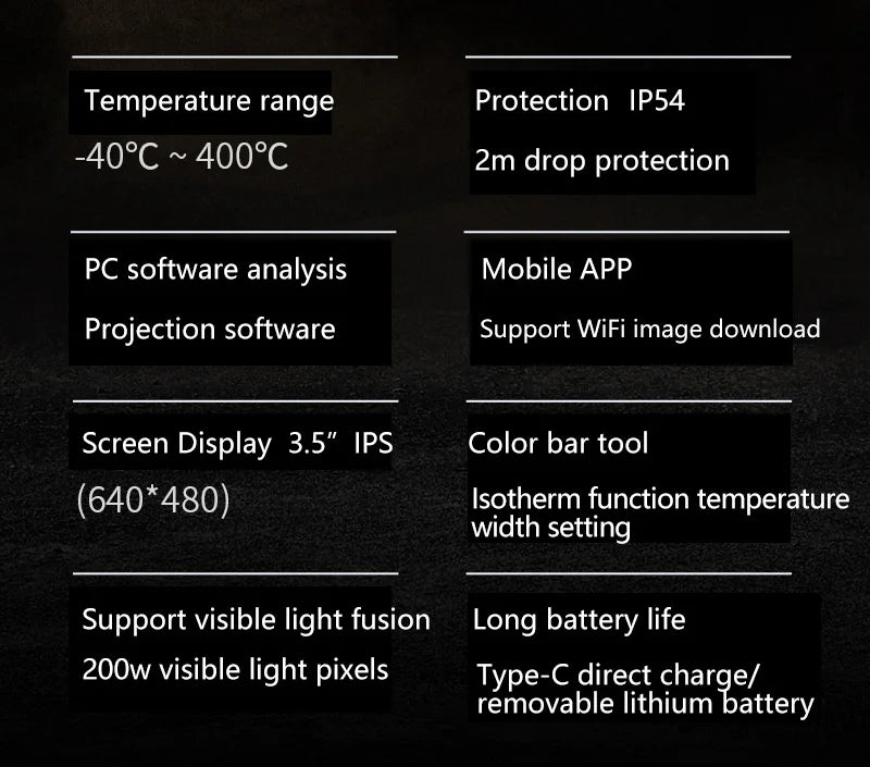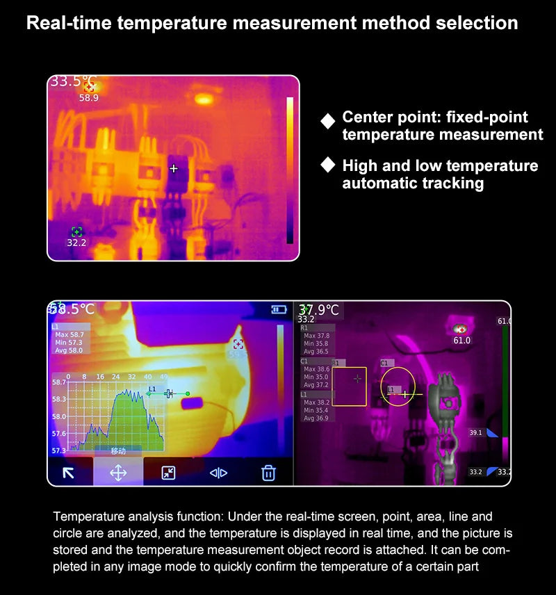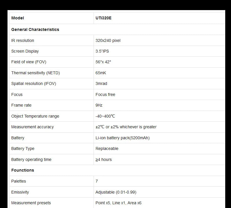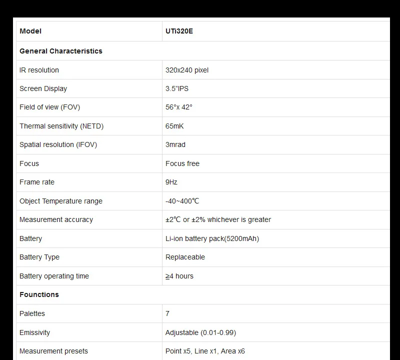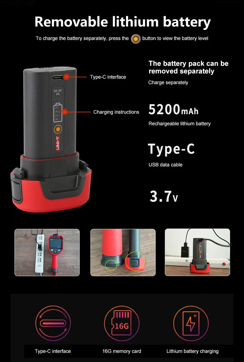 UNI-T Enhanced Thermal Imagers provide various functions compared with Classic and Echo series, such as flexible measurement presets, high resolution digital camera (2Megapixel), WiFi, Isotherm etc. The imager size is bigger which allows a bigger screen (3.5''IPS) for excellent display quality. Its replaceable battery modules allow the imager to have minimal down time, greatly improving productivity.