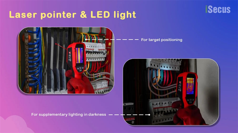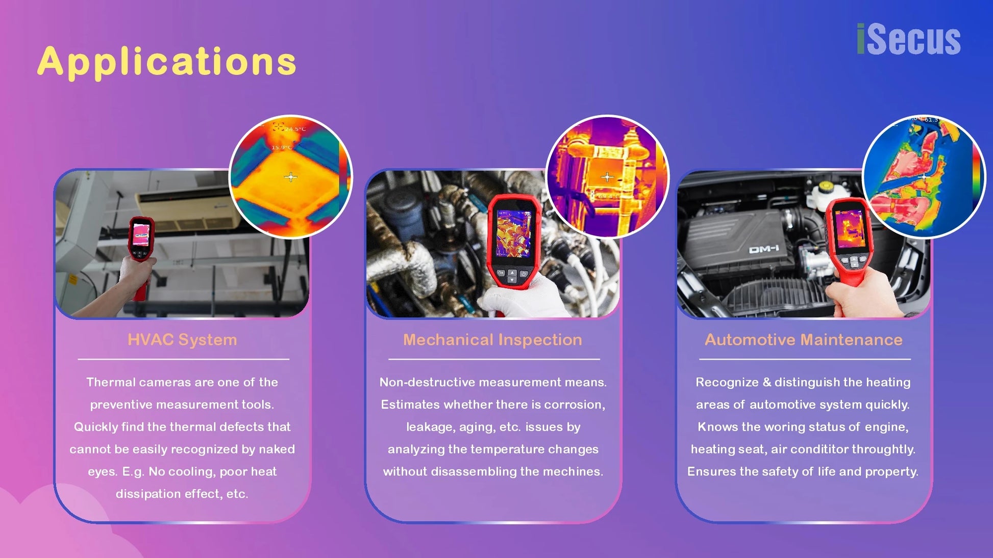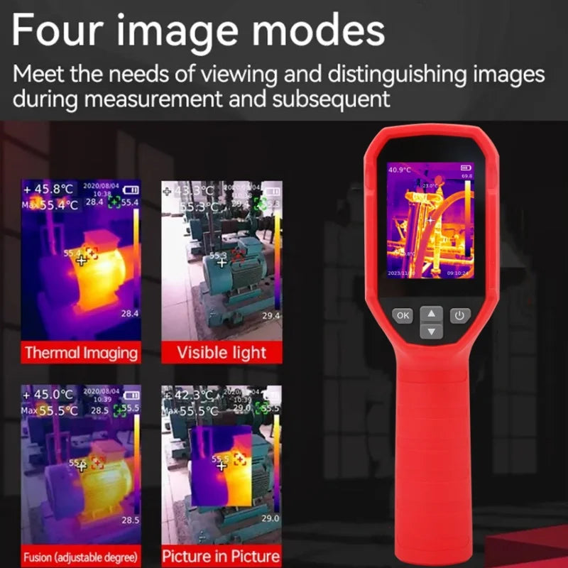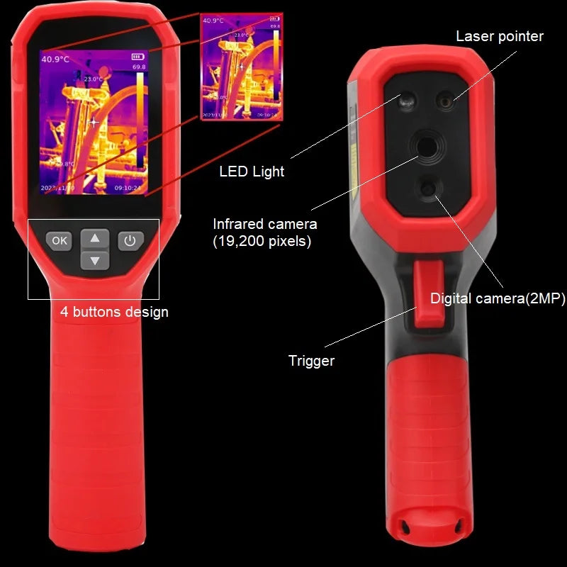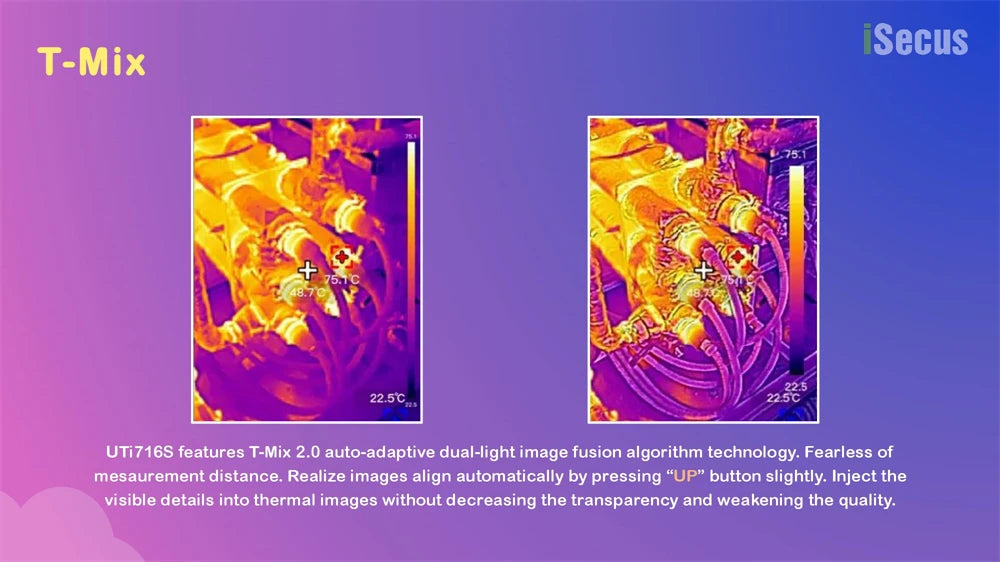UTi716S is equipped with a 12μm infrared detector with 160×120 pixels and 2MP digital camera, combined with Super resolution function and self-developed T-Mix auto-adaptive dual-light fusion algorithm technology for gernerating high-definition IR images with visible details. Its extended temp. measurement range and the built-in LED light & laser pointer meet more application scenarios. 4-button and light-weight design make inspection work easily. Widely used in HVAC, Automotive inspection and electric utility.