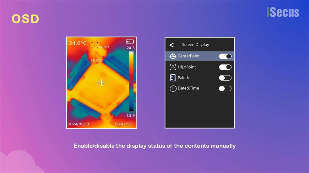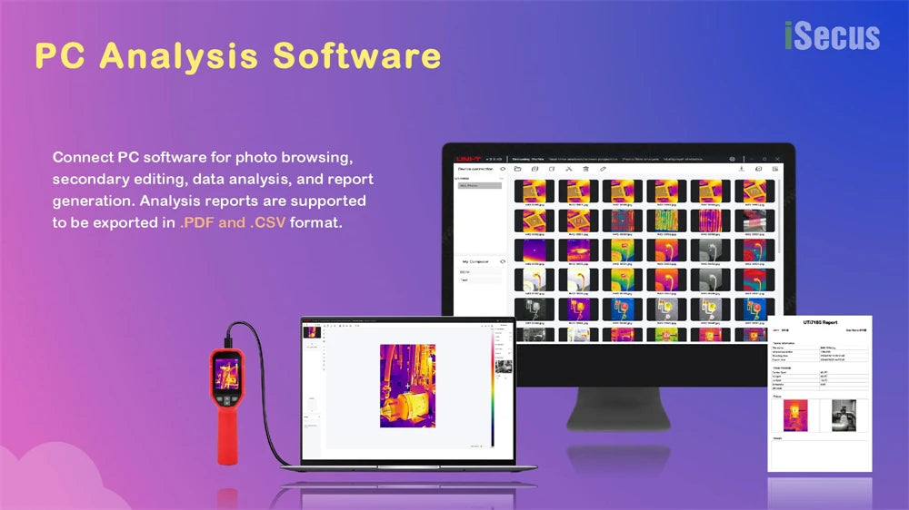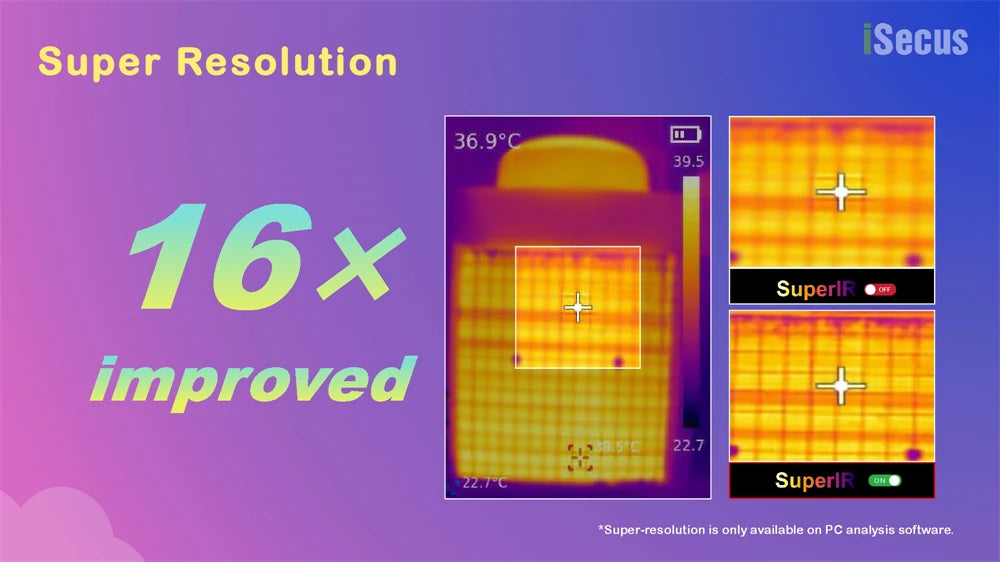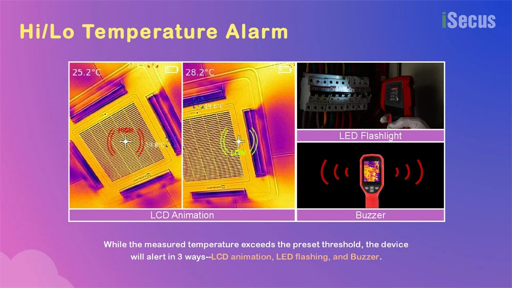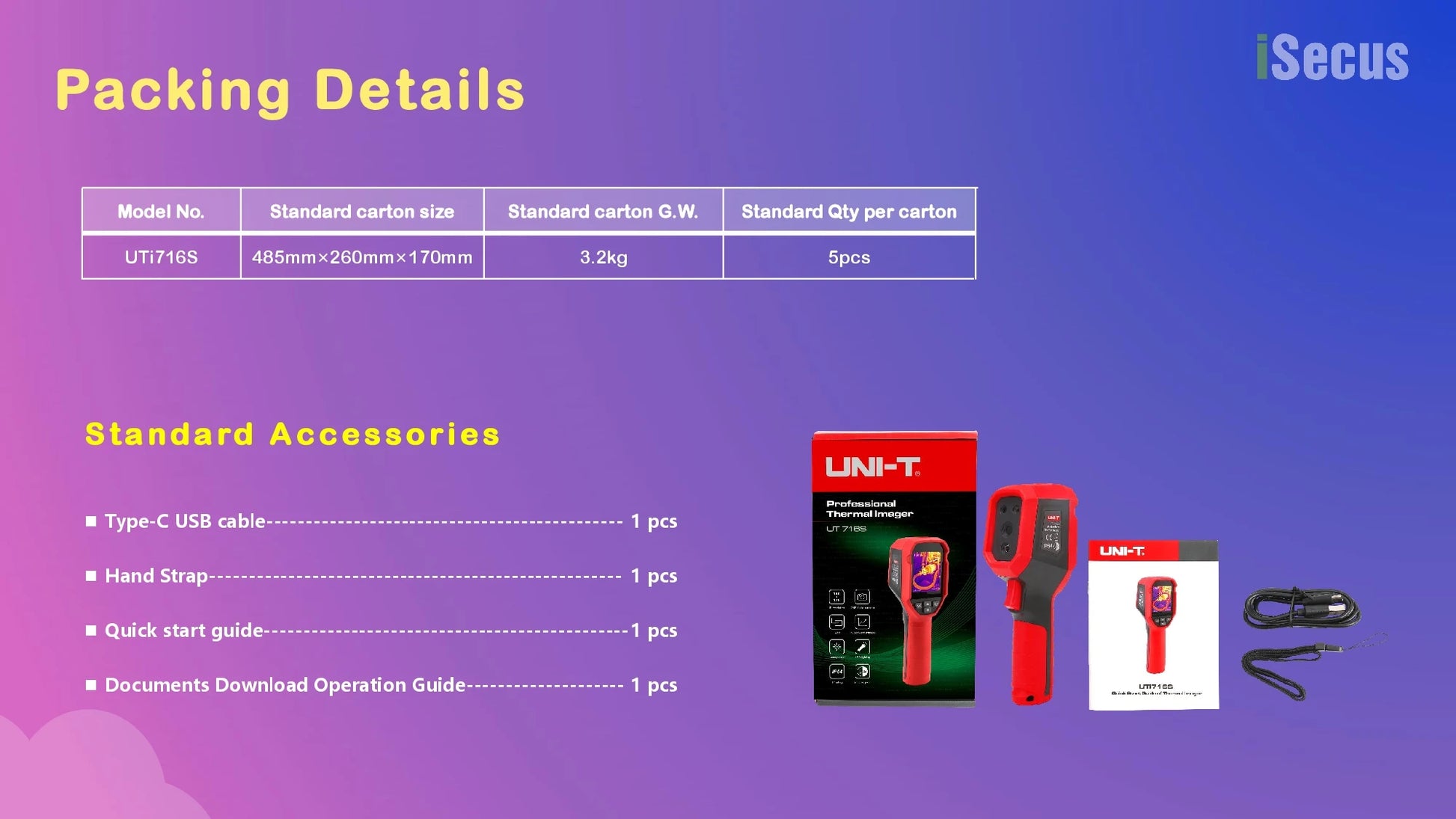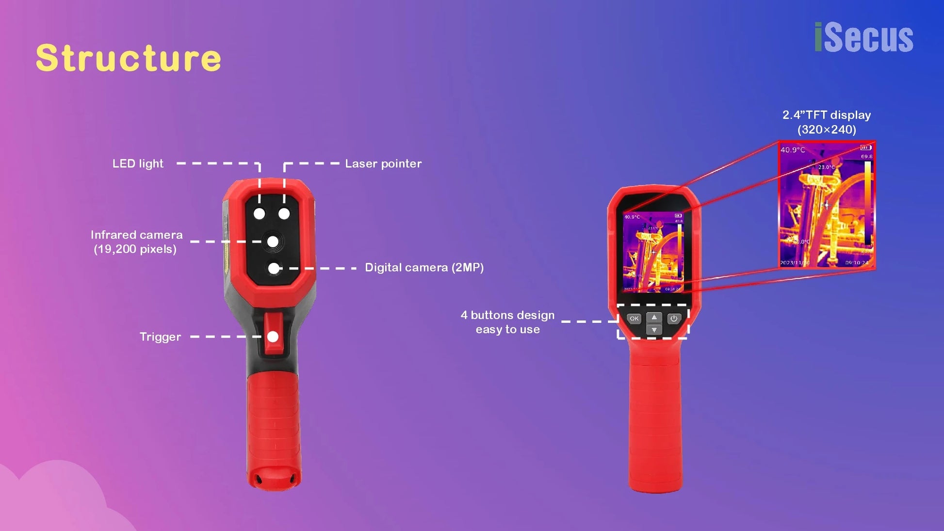 UTi716S is equipped with a 12μm infrared detector with 160×120 pixels and 2MP digital camera, combined with Super resolution function and self-developed T-Mix auto-adaptive dual-light fusion algorithm technology for gernerating high-definition IR images with visible details. Its extended temp. measurement range and the built-in LED light & laser pointer meet more application scenarios. 4-button and light-weight design make inspection work easily. Widely used in HVAC, Automotive inspection and electric utility.