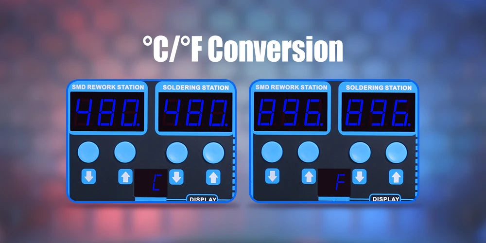 6. 3 Digital Displays- To show your current set parameters including temperature readouts for the soldering station, hot air rework station, and simulated air volume.